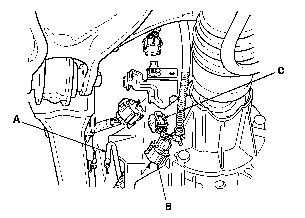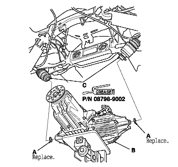 3. Apply appropriate grease to the splines of the rear driveshaft inboard joints (C). Rear Driveshaft Installation