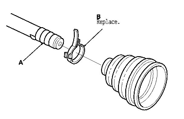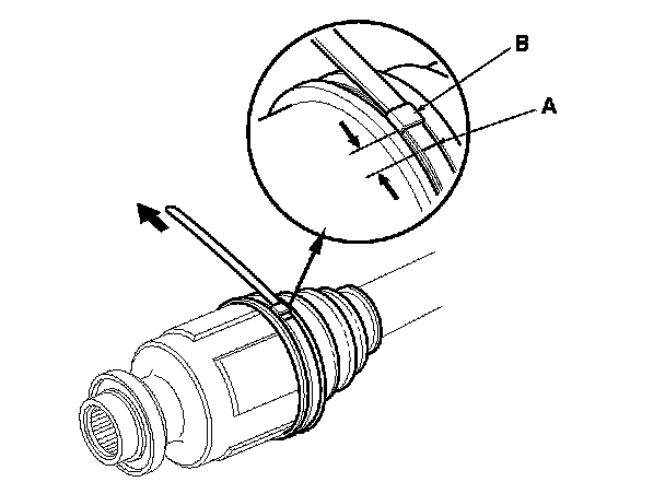 12. Fit the boot ends onto the driveshaft and the inboard joint, then install a new double loop band (A) onto the boot (B).