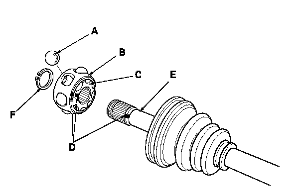 4. Install the bearing onto the driveshaft (E) by aligning the marks you made on the bearing and the driveshaft. Be careful not to drop the steel balls when installing the bearing onto the driveshaft.