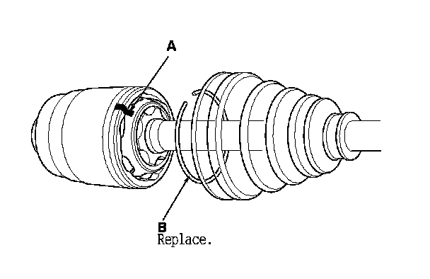 2. Install the inboard boot and boot band (B) onto the driveshaft, then remove the vinyl tape. Be careful not to damage the inboard boot.