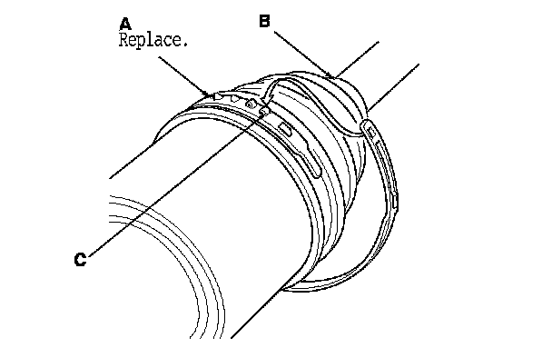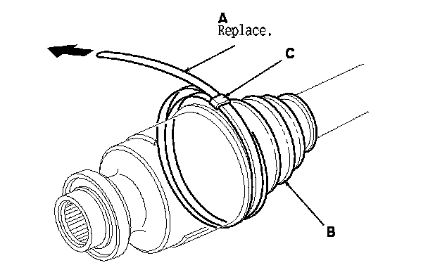10. Fit the boot ends (A) onto the driveshaft (B) and the outboard joint (C) grooves. Bleed any excess air from the boots by inserting a flat-tipped screwdriver between the boot and the joint.