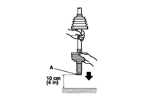 7. To completely seat the outboard joint, pick up the driveshaft and joint, and tap or hit the assembly onto a hard surface from a height of about 10 cm (4 in).