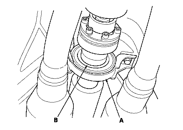 4. Check the rubber portion (B) of the center support bearing for damage and deterioration. If the rubber portion is damaged or deteriorated, replace the propeller shaft assembly.