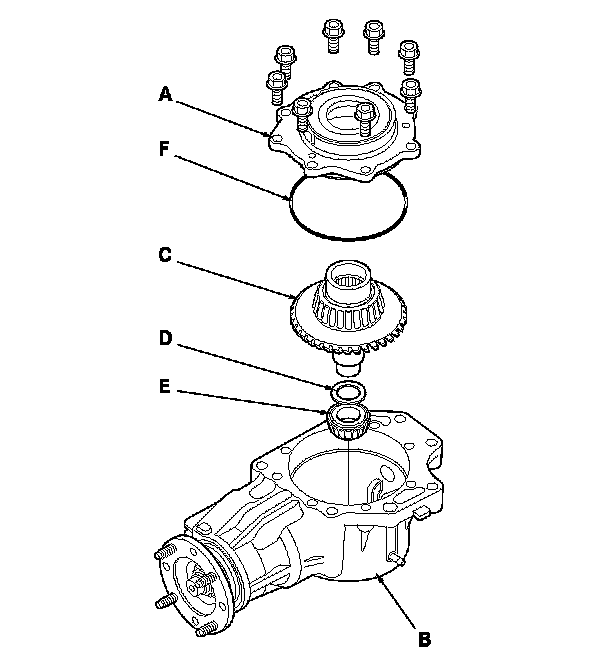 9. Remove the locknut (A), conical spring washer (B), back-up ring (C), O-ring (D), and companion flange (E) from the transfer output shaft (hypoid gear) (F).