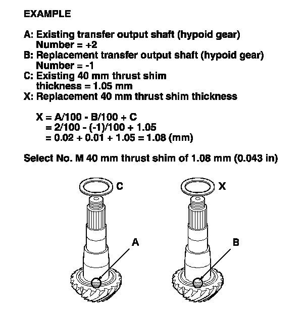 1. Select the 40 mm thrust shim if the transfer output shaft (hypoid gear) is replaced. Calculate the thickness of the 40 mm thrust shim using the following formula, and select the shim from the following table.