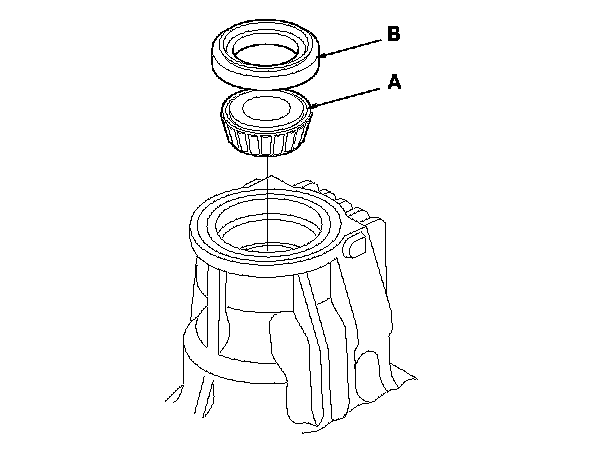4. Place the tapered roller bearing (A) on the bearing outer race of the companion flange side of the transfer housing, and install the new oil seal (B).