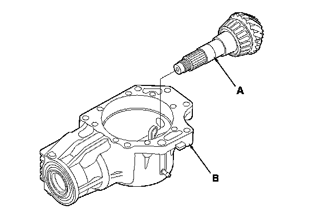 6. Install the transfer output shaft (hypoid gear) (A) in the transfer housing (B). Do not install the transfer spacer and thrust washer on the transfer output shaft (hypoid gear).