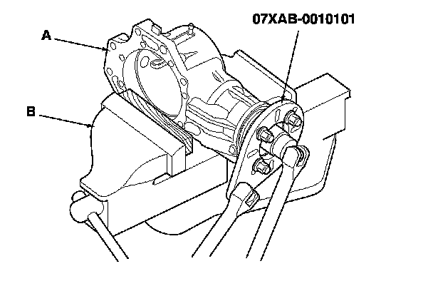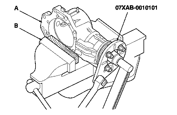 8. Secure the transfer housing (A) in a bench vise (B) with soft jaws. To prevent damage to the transfer housing, always use soft jaws or equivalent materials between the transfer housing and the vise.
