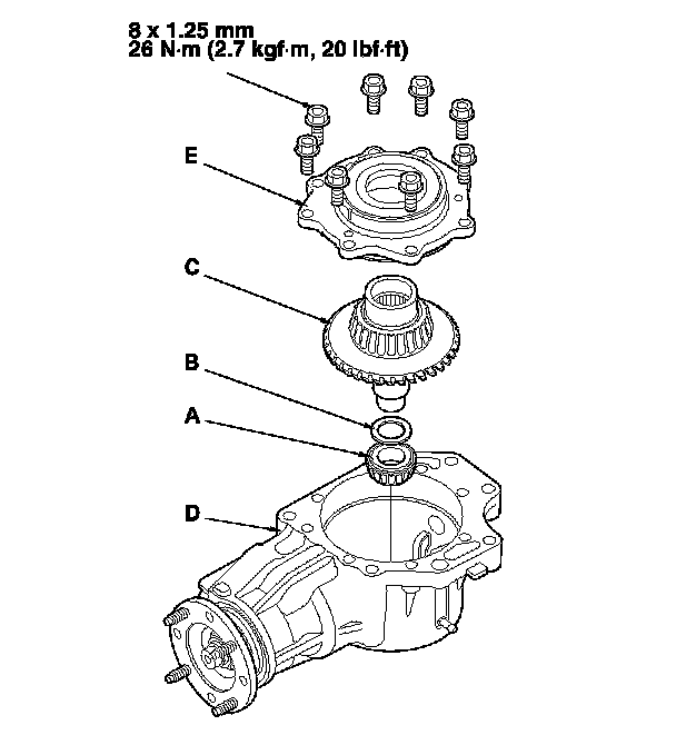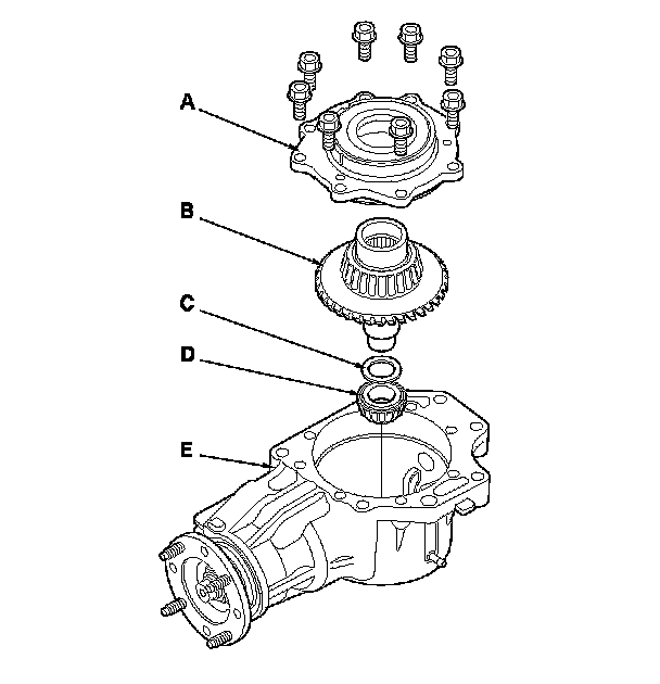 21. Remove the transfer cover (A), transfer hypoid drive gear/shaft assembly (B), 25 mm thrust shim (C), and tapered roller bearing (D) from the transfer housing (E) after adjusting the transfer gear backlash or transfer gear tooth contact.