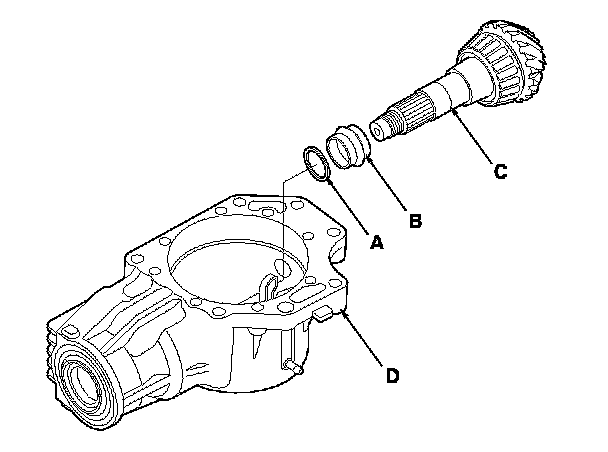 7. Install the companion flange (A), conical spring washer (B) (in the direction shown), and locknut (C) on the transfer output shaft (hypoid gear) (D). Do not install the O-ring and back-up ring.