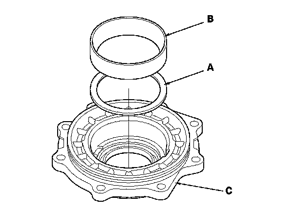 44. Install the 80 mm trust shim (A) and the bearing outer race (B) in the transfer cover (C). If you heated the cover, let it cool to room temperature before installing the thrust shim.