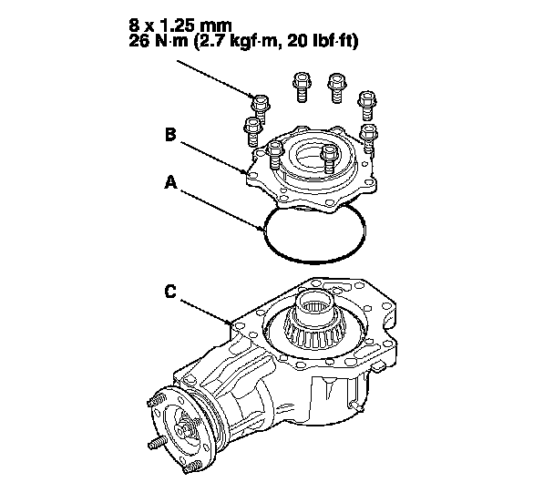 47. Install the new O-ring (A) on the transfer cover (B), then install the cover on the transfer housing (C).