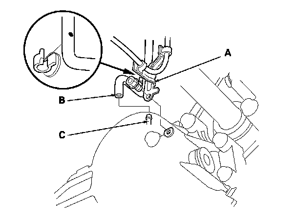 6. Remove the bolt securing the transfer breather hose bracket (A), and disconnect the breather hose (B) from the breather pipe (C) on the transfer assembly.