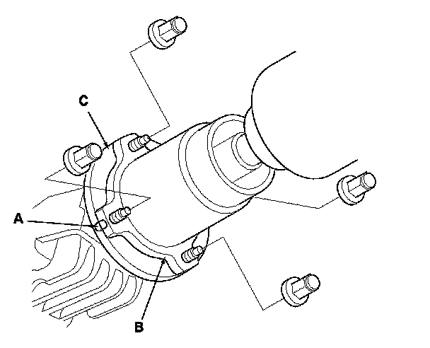 7. Make a reference mark (A) across the propeller shaft (B) and the transfer companion flange (C).