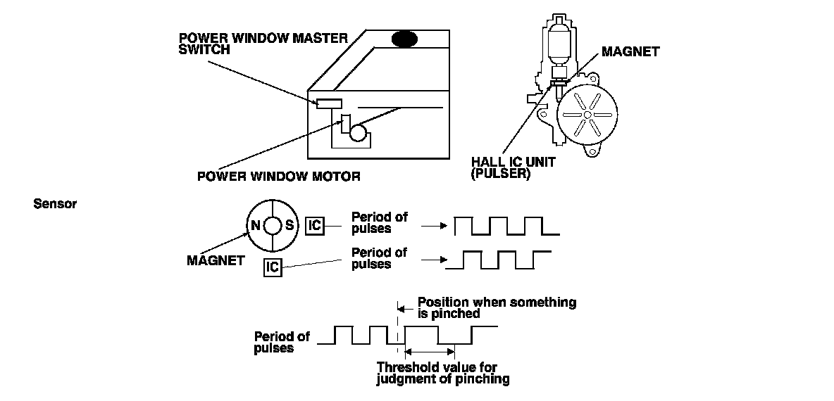 The power window motor incorporates a Hall IC unit (pulser) which generates pulses during the motor's operation and sends pulses to the power window control unit. As soon as the power window control unit detects a change in pulse frequency from the Hall IC unit (pulser), the power window control unit makes the power window motor stop and reverse. This prevents pinching your hand or fingers during auto-up operation. The auto reverse function does not work when the driver's window switch is held in the up position.