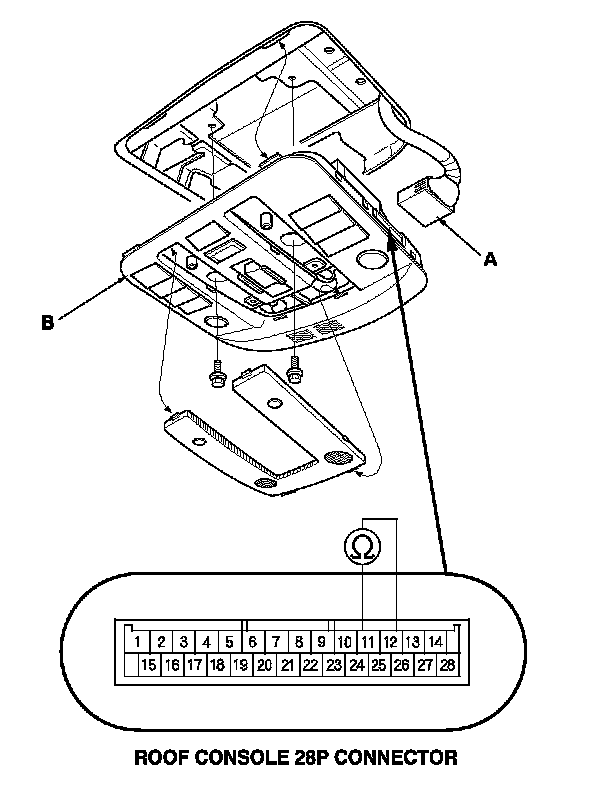 2. Disconnect the 28P connector (A) from the roof console (B).