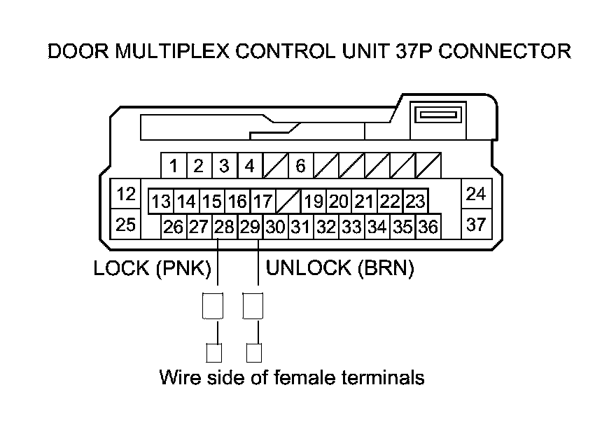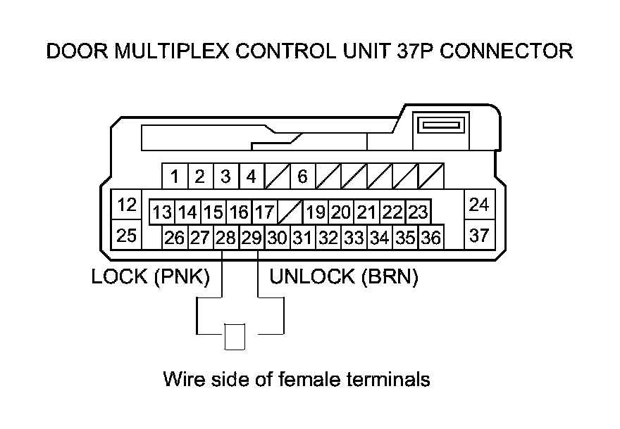 15. Check for continuity between door multiplex control unit 37P connector terminals No. 28 and No. 29.