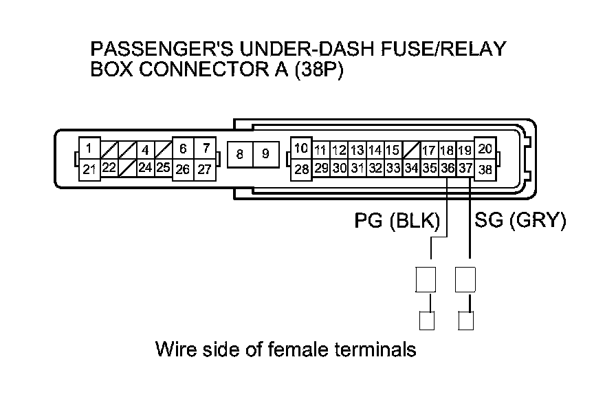 8. Measure the voltage between body ground and passenger's under-dash fuse/relay box connector A (38P) terminals No. 36 and No. 37, and between body ground and connector E (18P) terminals No. 15 and No. 16 individually.