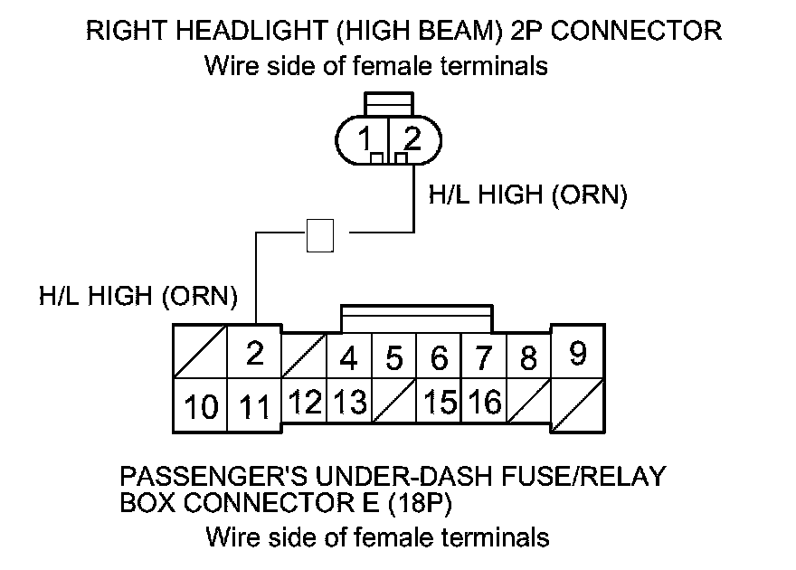 15. Check for continuity between passenger's under-dash fuse/relay box connector E (18P) terminal No. 2 and right headlight (high beam) 2P connector terminal No. 2.