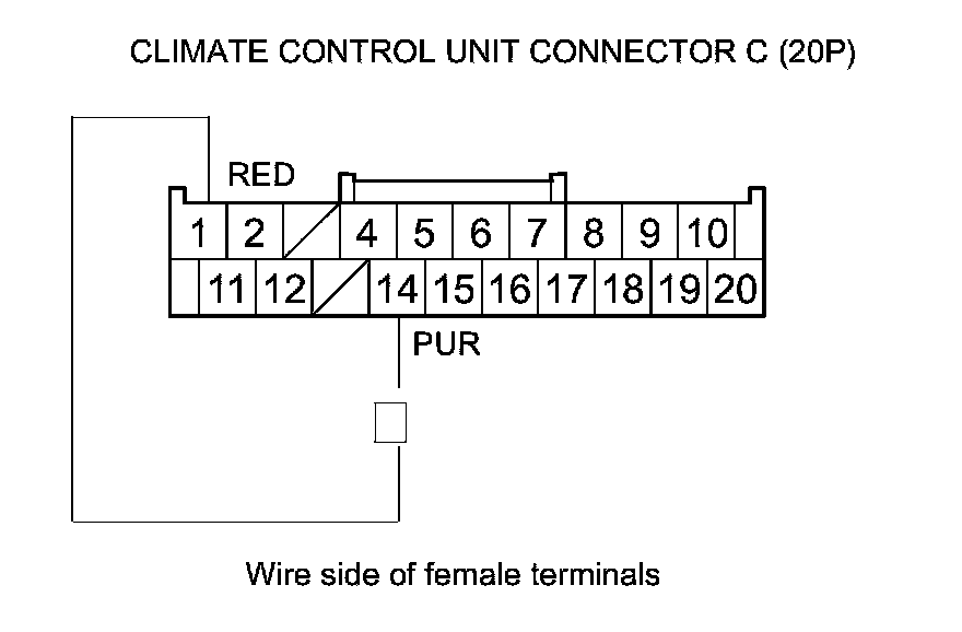 9. Check for continuity between climate control unit connector C (20P) terminals No. 1 and No. 14.