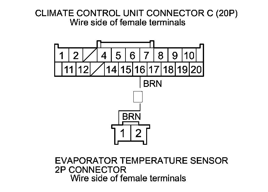 8. Check for continuity between climate control unit connector C (20P) terminal No. 16 and evaporator temperature sensor 2P connector terminal No. 1.