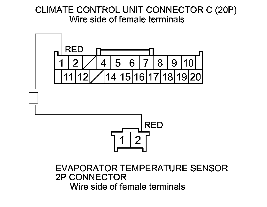 9. Check for continuity between climate control unit connector C (20P) terminal No. 1 and evaporator temperature sensor 2P connector terminal No. 2.