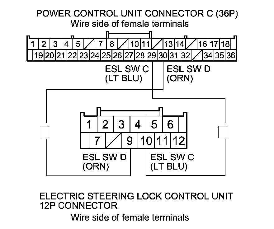 8. Check for continuity between power control unit connector C (36P) terminals No. 29 and No. 30, and electric steering lock 12P connector terminals No. 10 and No. 9 respectively.