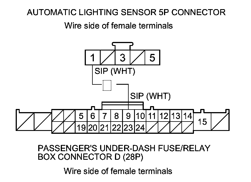 11. Check for continuity between passenger's under-dash fuse/relay box connector D (28P) terminal No. 9 and automatic lighting sensor 5P connector terminal No. 1.