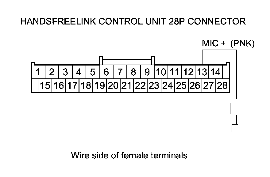 12. Check for continuity between HandsFreeLink control unit 28P connector terminal No. 13 and HFL-navigation microphone 7P connector terminal No. 3.