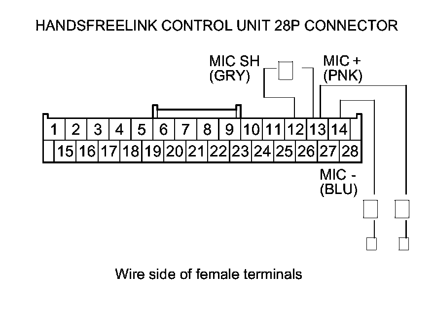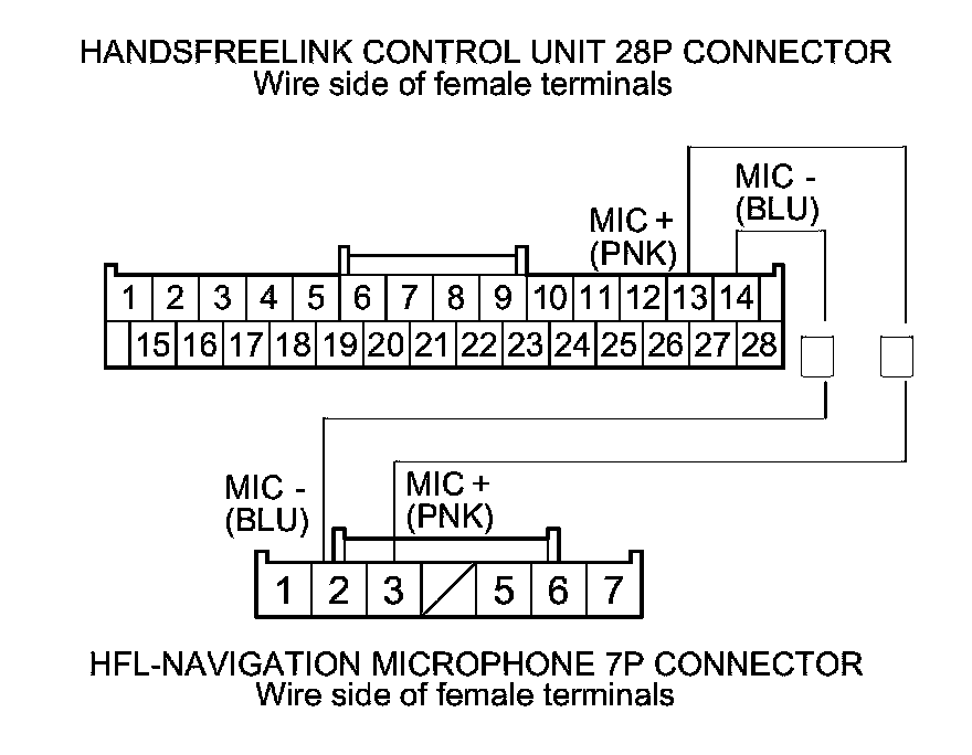 10. Check for continuity between HandsFreeLink control unit 28P connector terminals No. 13 and No. 14 and HFL-navigation microphone 7P connector terminals No. 3 and No. 2 respectively.