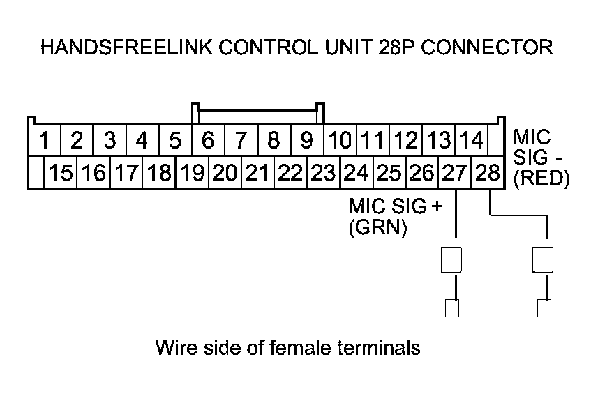 12. Check for continuity between body ground and HandsFreeLink control unit 28P connector terminals No. 27 and No. 28 individually.