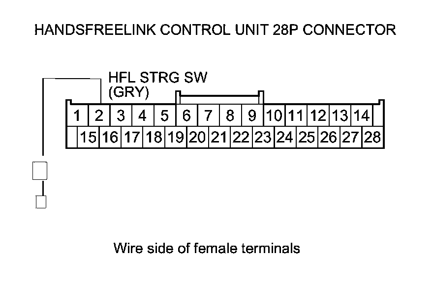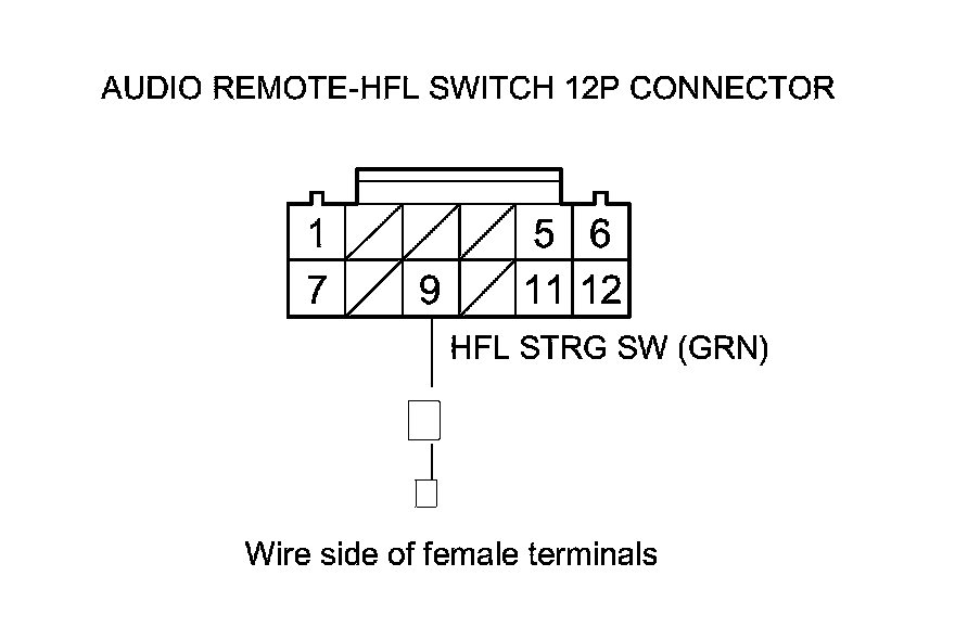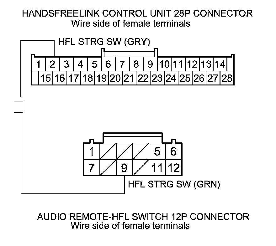 13. Check for continuity between HandsFreeLink control unit 28P connector terminal No. 2 and audio remote-HFL switch 12P connector terminal No. 9.
