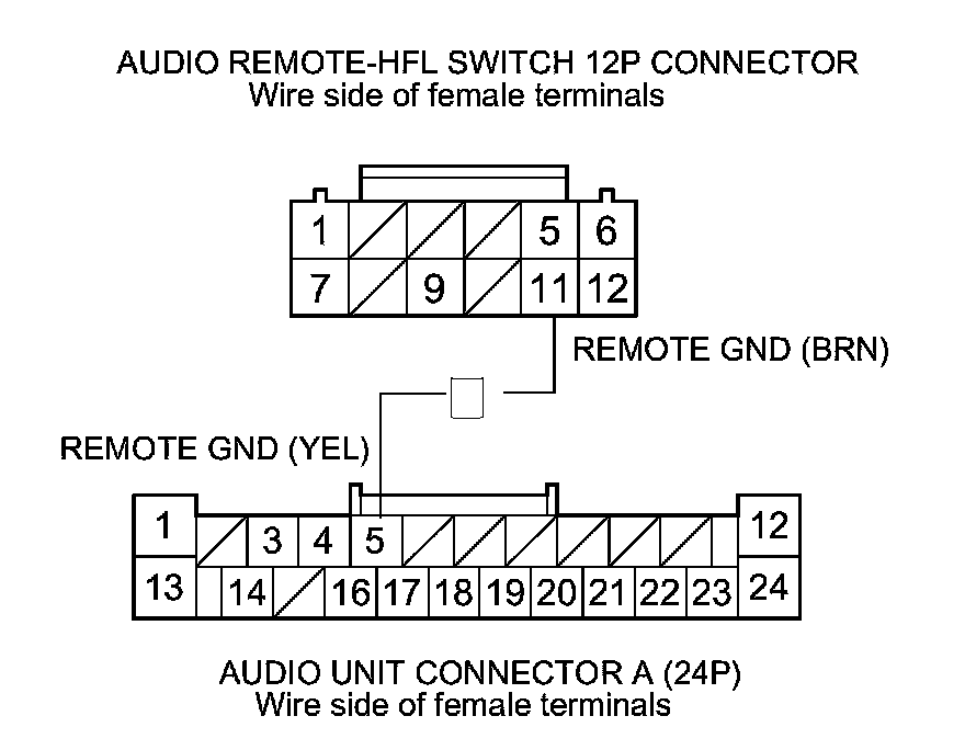 19. Check for continuity between audio remote-HFL switch 12P connector terminal No. 11 and audio unit connector A (24P) terminal No. 5.