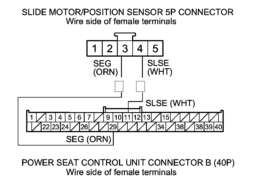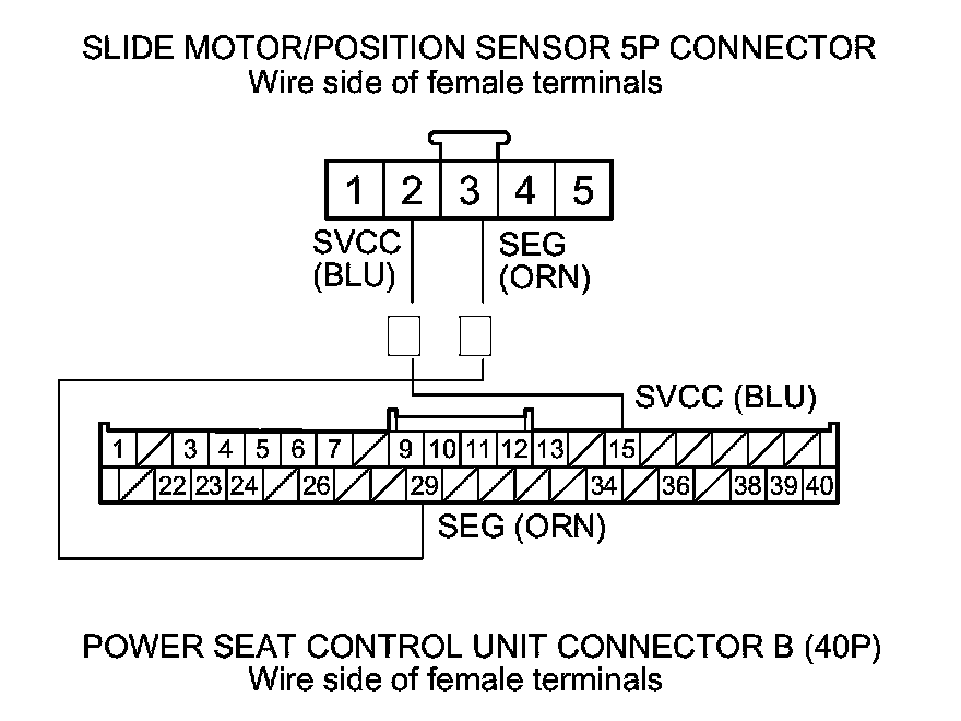 20. Check for continuity between power seat control unit connector B (40P) terminals No. 15 and No. 29 and slide motor/position sensor 5P connector terminals No. 2 and No. 3 respectively.
