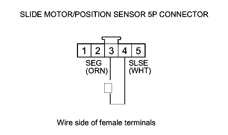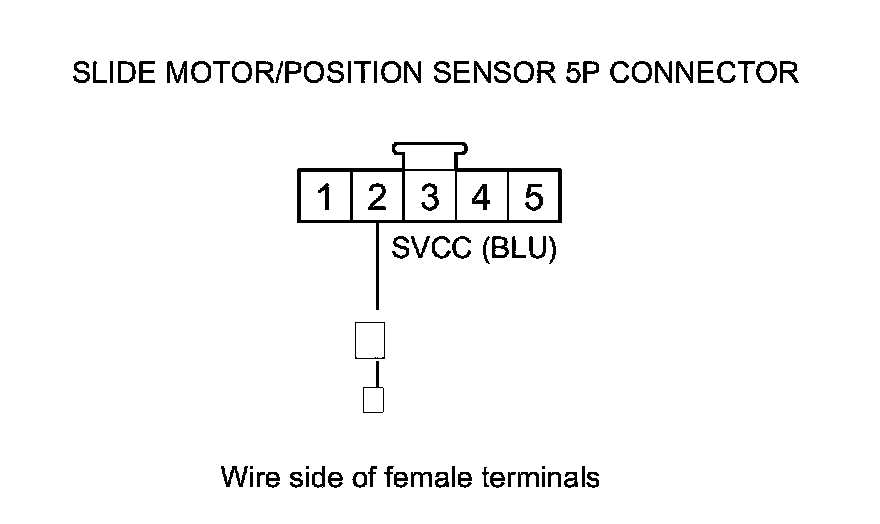 16. Measure the voltage between slide motor/position sensor 5P connector terminals No. 4 (+) and No. 3 (-).