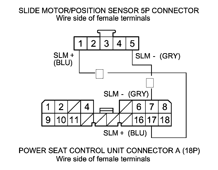 29. Check for continuity between power seat control unit connector A (18P) terminals No. 17 and No. 7 and slide motor/position sensor 5P connector terminals No. 1 and No. 5 respectively.