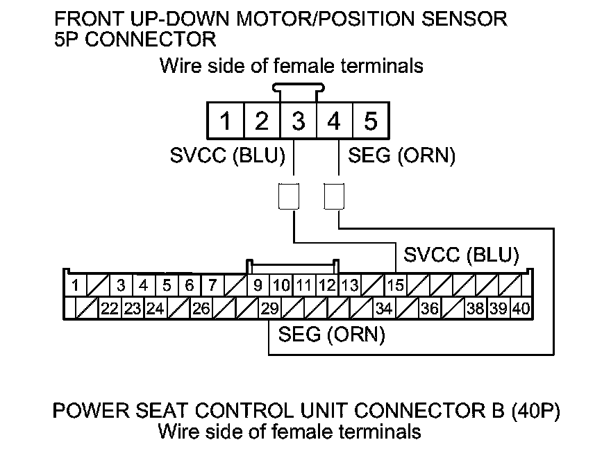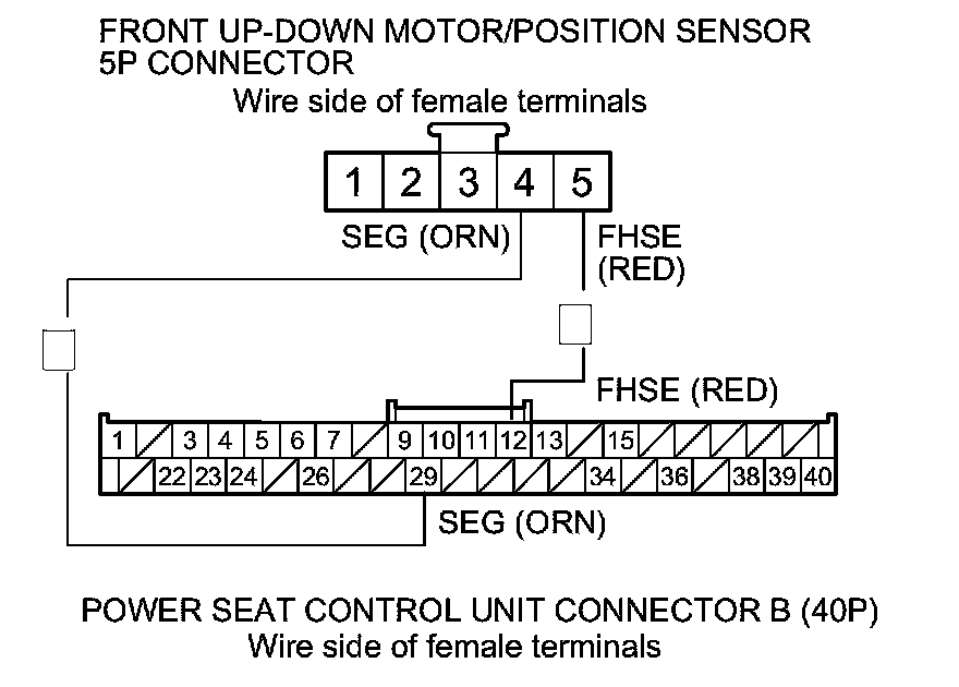 12. Check for continuity between power seat control unit connector B (40P) terminals No. 12 and No. 29 and front up-down motor/position sensor 5P connector terminals No. 5 and No. 4 respectively.