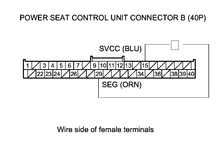 25. Measure the voltage between power seat control unit connector B (40P) terminals No. 15 and No. 29.