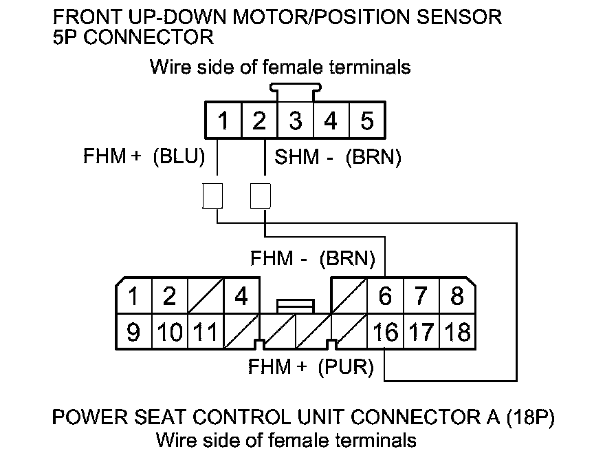29. Check for continuity between power seat control unit connector A (18P) terminals No. 6 and No. 16 and front up-down motor/position sensor 5P connector terminals No. 2 and No. 1 respectively.