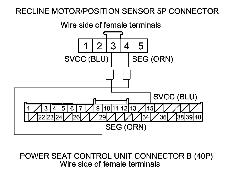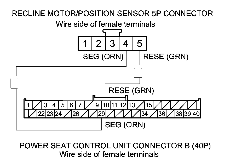 20. Check for continuity between power seat control unit connector B (40P) terminals No. 15 and No. 29 and recline motor/position sensor 5P connector terminals No. 3 and No. 4 respectively.