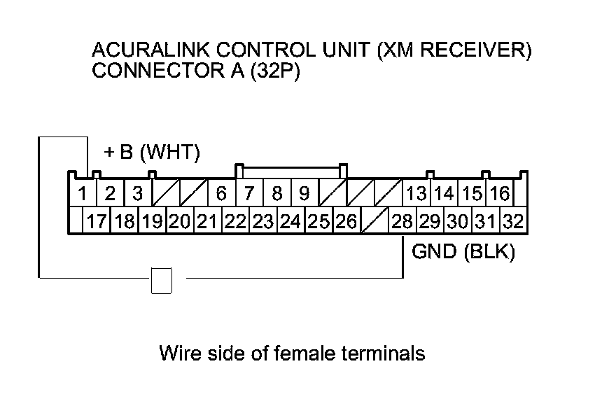 6. Measure the voltage between AcuraLink control unit connector A (32P) terminals No. 1 and No. 28.