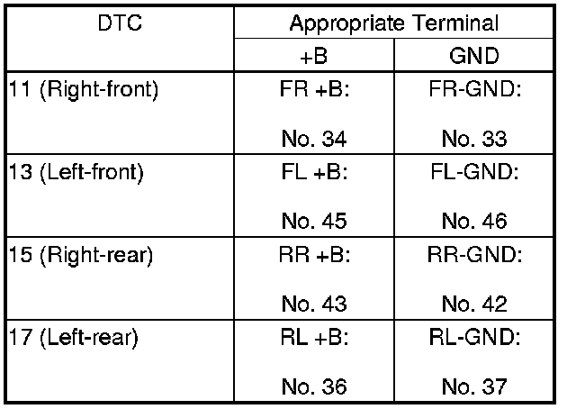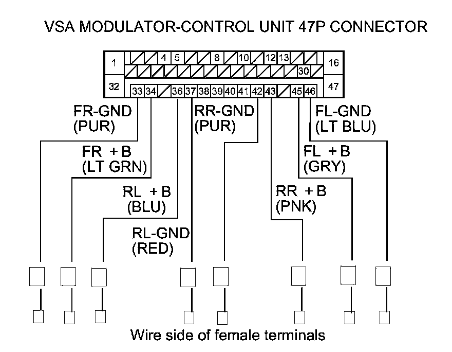 16. Check for continuity between body ground and the appropriate wheel speed sensor +B and GND terminals of the VSA modulator-control unit 47P connector individually (see table).