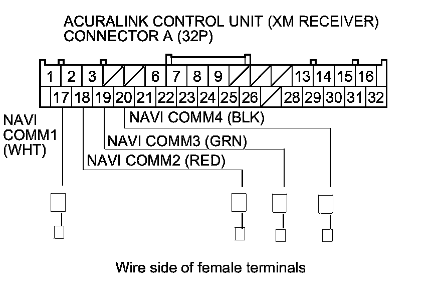 11. Check for continuity between body ground and AcuraLink control unit (XM receiver) connector A (32P) terminals No. 17, No. 18, No. 19, and No. 20 individually.
