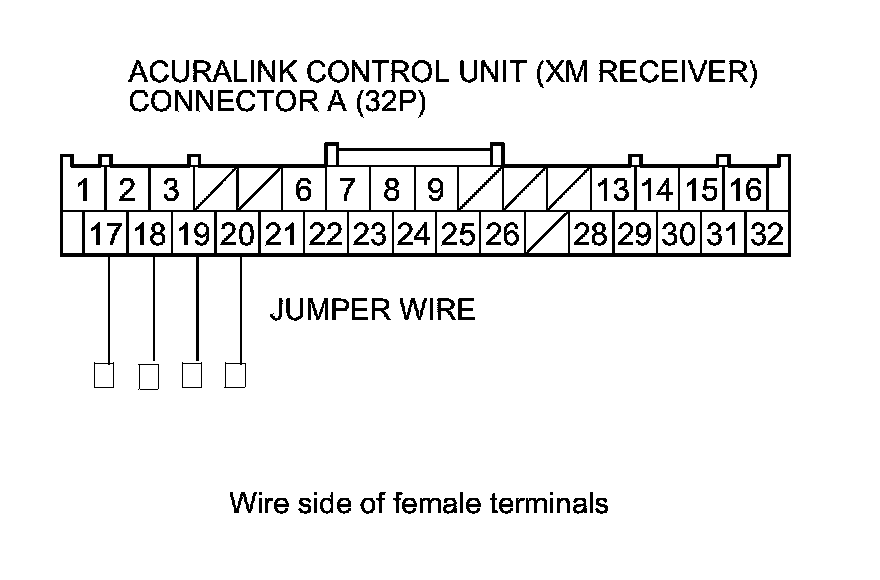 12. Connect AcuraLink control unit (XM receiver) connector A (32P) terminals No. 17, No. 18, No. 19, and No. 20 to body ground with jumper wires.