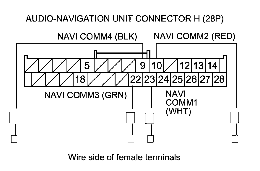 13. Check for continuity between body ground and audio-navigation unit connector H (28P) terminals No. 9, No. 10, No. 22, and No. 23 individually.