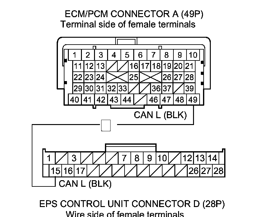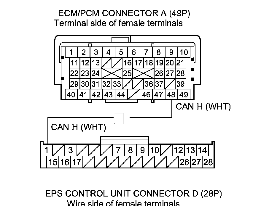 14. Check for continuity between EPS control unit connector D (28P) terminal No. 15 and ECM/PCM connector A (49P) terminal No. 49.