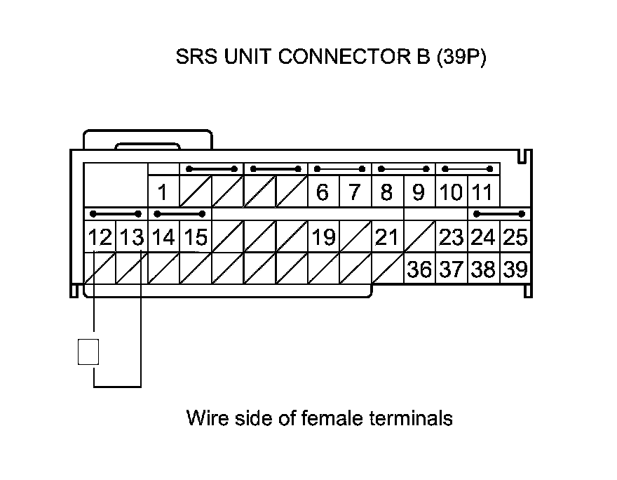 15. Measure the resistance between SRS unit connector B (39P) terminals No. 12 and No. 13. There should be 2.0-3.0 Ohms.