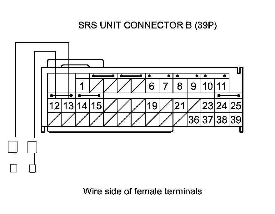 15. Measure the resistance between body ground and SRS unit connector B (39P) terminals No. 12 and No. 13 individually. There should be an open circuit or at least 1 MOhms.