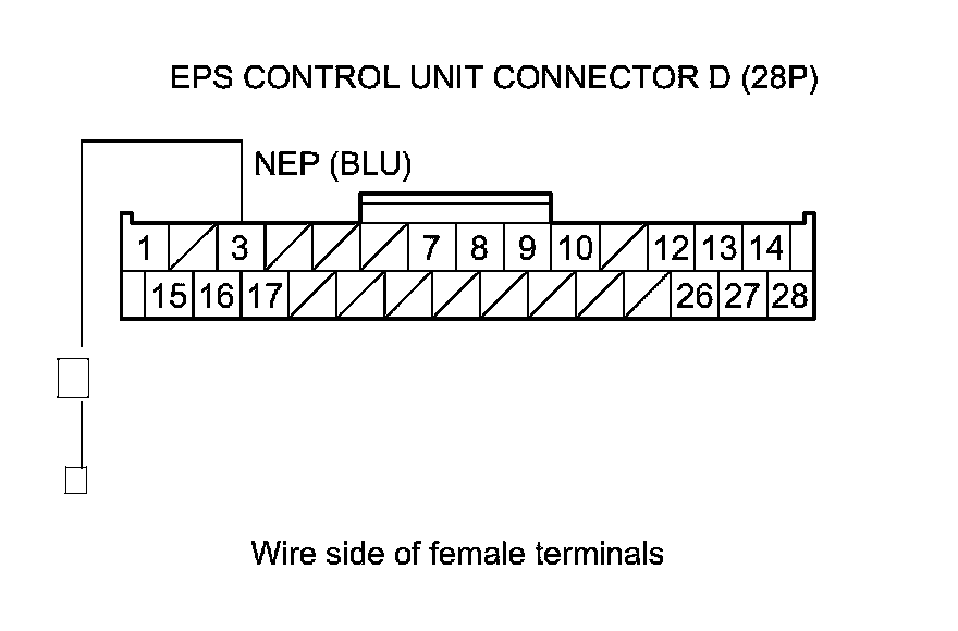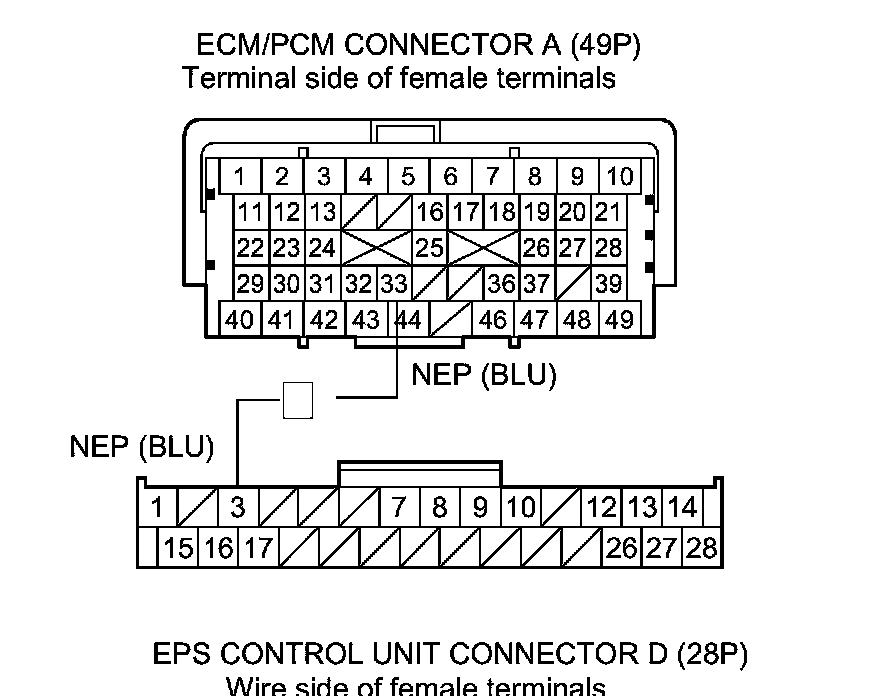 11. Check for continuity between EPS control unit connector D (28P) terminal No. 3 and ECM/PCM connector A (49P) terminal No. 33.