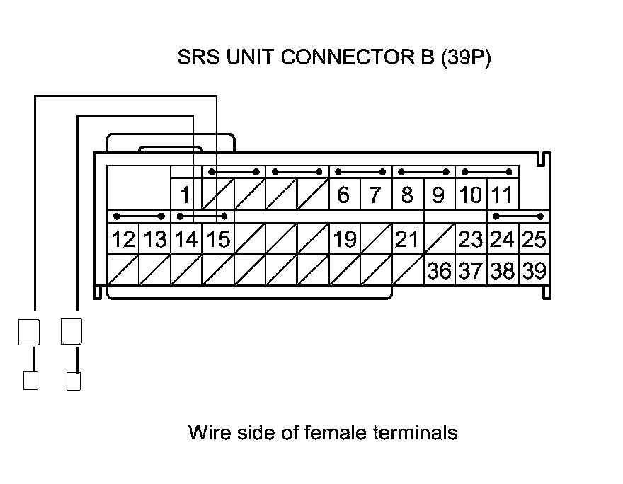 17. Measure the voltage between body ground and SRS unit connector B (39P) terminals No. 14 and No. 15 individually. There should be less than 0.2 V.